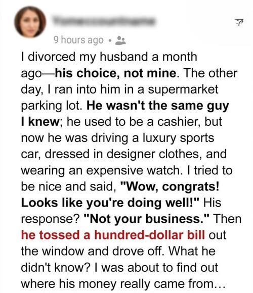I divorced my husband a month ago—his choice, not mine. The other day, I ran into him in a supermarket parking lot.