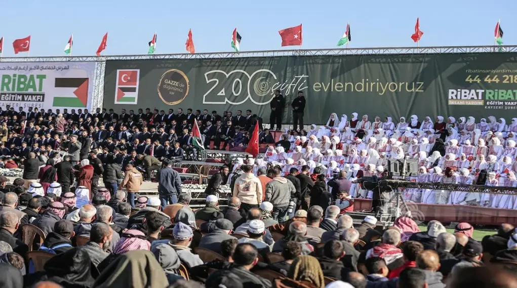 Dhjetëra qytetarë kanë marrë pjesë në një dasmë kolektive për rreth 200 nuse dhe dhëndurë, të organizuar në zonën Al-Zawaida, në qendër të Rripit të Gazës.